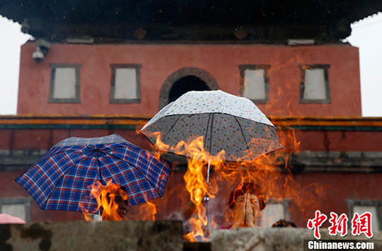 7月15日,游客在河北省承德市的普宁寺双手合十,十分虔诚地雨中祈祷。中新社发 刘关关 摄