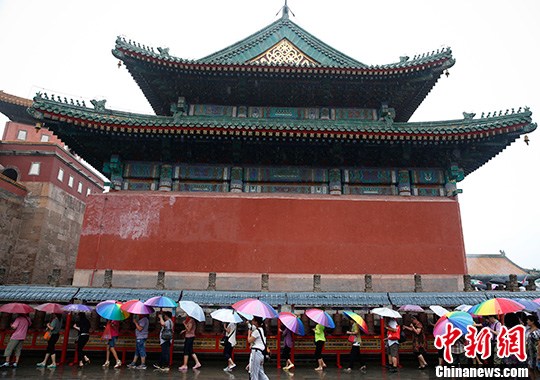 7月15日,游客撑着彩色的雨伞在河北省承德市的普宁寺拨动转经筒,虔诚地雨中祈祷。中新社发 刘关关 摄