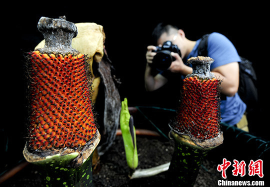 图为刚刚在北京植物园出尽风头的“巨魔芋”花开四朵,成为名副其实的“四喜丸子”,尚属全球首例。中新社发 陆欣 摄