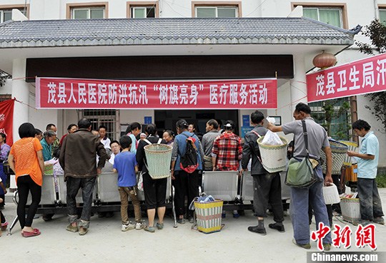 7月15日,四川茂县人民医院医疗救助小分队带着22个药品种类的药品来到茂县富顺乡甘沟村,为当地受灾民众免费看病发放药品。图为送医送药现场。中新社发 安源 摄
