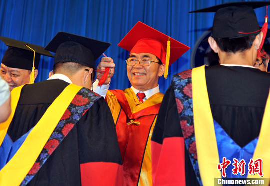 中科院院长、国科大校长白春礼院士等出席当天的仪式,为获授博士、硕士学位的毕业生代表扶正流苏。中新社发 孙自法 摄