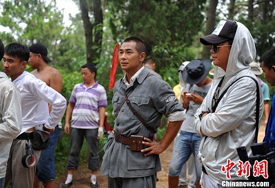 7月15日,大型近代革命历史题材电视连续剧《铁血红安》正在湖北红安县火热拍摄中。当天剧组正在拍摄日军攻打黄安城的戏份,炎热的7月,演员们还身穿厚实的戏服,就连功夫巨星赵文卓也在片场抱怨天气太热。图为赵文卓在片场拍戏中。张畅 摄