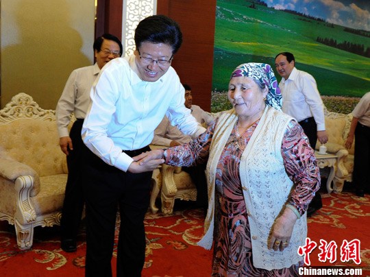 图为演出结束后,中共中央政治局委员、新疆维吾尔自治区党委书记张春贤会见了《情暖天山》的原型阿尼帕·阿力马洪老人,并热情搀扶老人入座。中新社发 刘新 摄