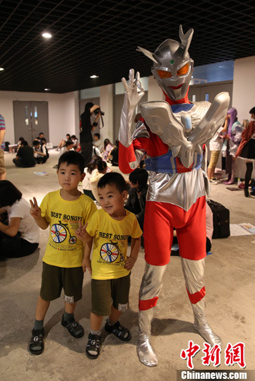 7月21日,一位动漫迷扮演“奥特曼”,引小粉丝合影留念。中新社发 韩海丹 摄