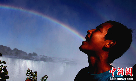 加拿大著名的尼亚加拉大瀑布夏日出现绚丽的双彩虹,一名来自中国广东的小男孩正在调皮地“吞吐”彩虹。中新社发 赖海隆 摄
