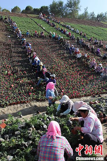 距离第三届中国—亚欧博览会开幕还有一月之余,7月26日,近千名群众在新疆国际会展中心周边爬山栽花,摆放各种造型的花卉景观。此次摆放的花卉品种达数十种,约200万株左右,五色草共计上千平米。中新社发 陶拴科 摄