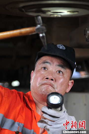 图为今年53岁的王海明忍受着高温炙烤,钻进机车底部进行检查。 刘占昆 摄