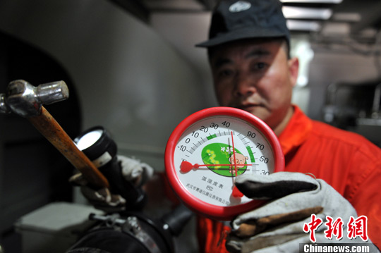 图为王海明在机车机房内展示一个圆盘温度计,上面显示已经高达43℃。刘占昆 摄