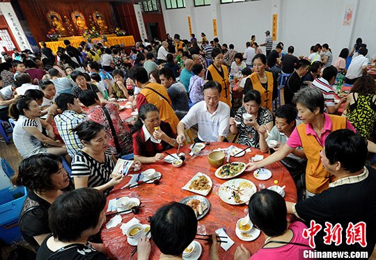 7月26日,农历观音诞,福州千年古刹于山定光寺举办观音诞千人素宴,吸引众多信众前来参加,十分壮观。 中新社发 刘可耕 摄