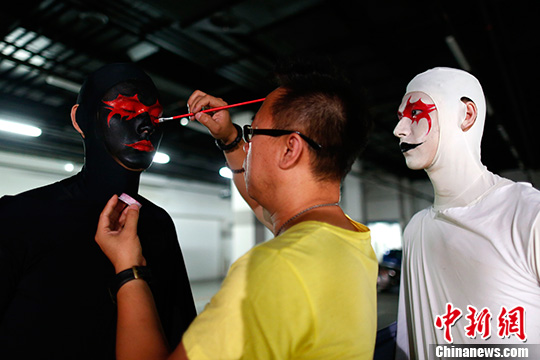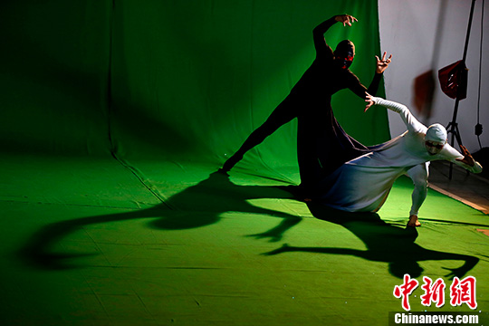 7月26日,鸟巢视听驻场秀《鸟巢·吸引》的视觉设计团队英国WMP在棚拍“影子舞”。中新社发 富田 摄