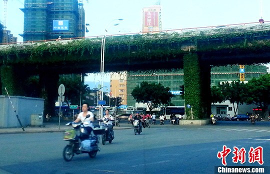 7月26日,福州持续高温天气,市区一高架桥桥底和桥墩被绿色植被覆盖,如同穿上绿色的衣服,给过往市民阵阵凉意。中新社发 王东明 摄