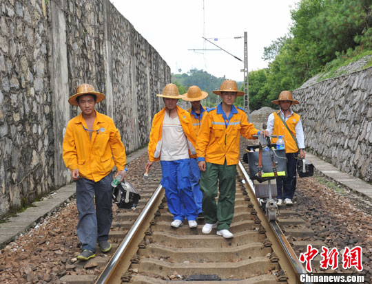 7月24日,南昆铁路江所田工区探伤工冒着钢轨轨面60多度高温,对管内200个钢轨焊缝逐一进行探伤。图为携带各种工具的探伤小组巡线。王艳龙 摄