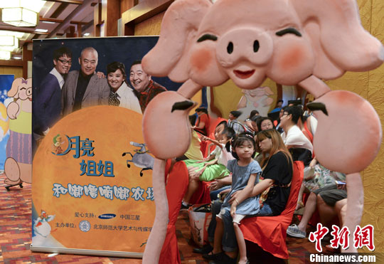 7月26日,首部爱心音乐童话剧《月亮姐姐和嘟噜嘀嘟农场》在北京举行新闻发布会,小观众在现场等候与该剧主创见面。中新社发 廖攀 摄