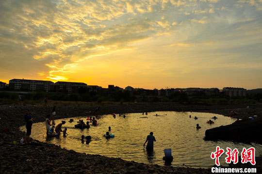位于湖南省西部的麻阳县往日数百米宽的锦江如今几乎断流,市民在“池塘”中消暑。蒋光禄 摄