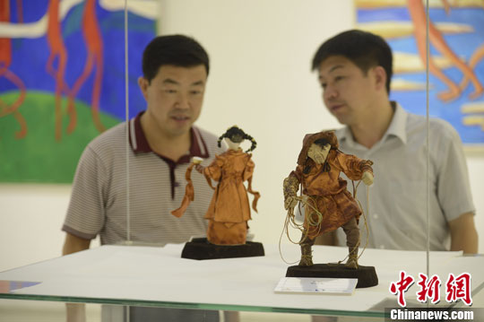7月26日,中蒙当代艺术展在呼和浩特开展,中国艺术家与蒙古国艺术家的作品让观展人士看的津津有味。中新社发 刘文华 摄