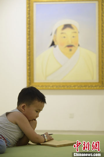 7月26日,中蒙当代艺术展在呼和浩特开展,中国艺术家与蒙古国艺术家的作品让小朋友看的津津有味。中新社发 刘文华 摄