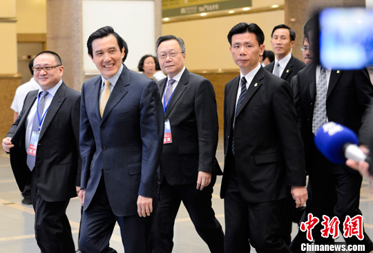 7月30日上午,台湾地区领导人马英九出席“关键时刻2013为台湾经济开路高峰会”。图为马英九走出会场,面对媒体追问笑而不答。刘震 摄
