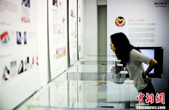 7月30日,一位大学教师在北京朝阳公园的索尼探梦科技馆观看“2012索尼学生设计工作坊”的作品展。中新社发 陆欣 摄