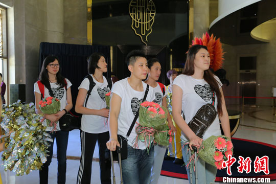 7月30日,中国女排运动员在主教练郎平带领下抵达澳门。图为获提名为“银河娱乐之星”的王一梅(前排右)及张磊(前排左)。中新社发 龙土有 摄