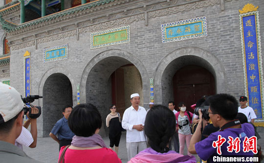 7月30日两岸记者参访宁夏永宁县回族民族文化。图为两岸记者参观永宁县纳家户清真寺。中新社发 石龙洪 摄