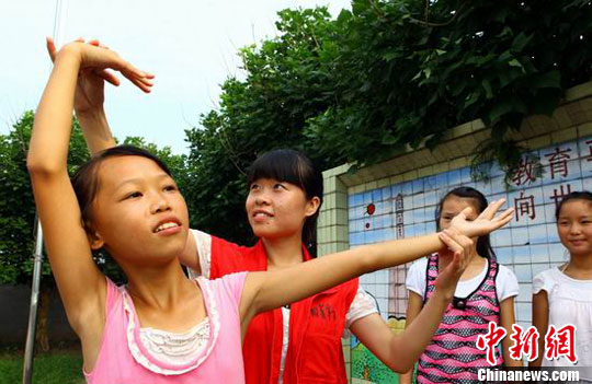 7月31日, 来自成都大学的大学生志愿者在四川省华蓥山区高兴镇海军希望小学给暑期中的“留守儿童”教练舞蹈。唐静 摄