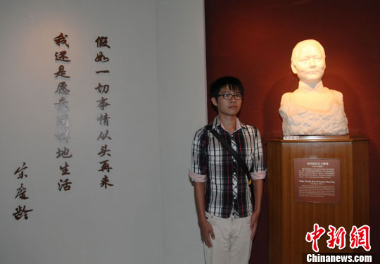 图为一位台生与宋庆龄雕塑合影。中新社发 陈小愿 摄