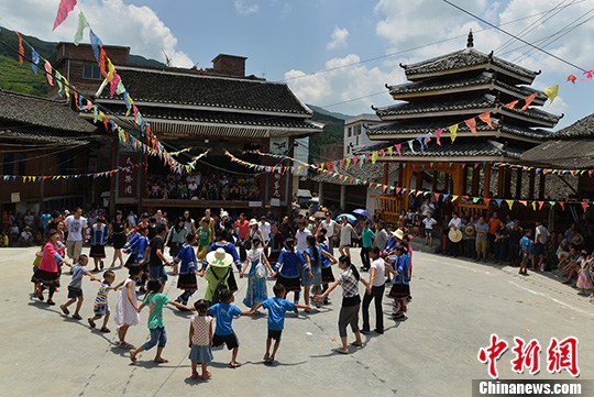 7月31日,广西桂林市龙胜各族自治县乐江乡地灵侗寨举办一年一度的“百家宴”民俗文化活动。每年这天,侗族同胞都会远道赶回来,邀请周边的亲朋好友一起唱起团圆歌、跳起团圆舞,并聚集到村头的风雨桥共享百家长桌盛宴,增强民族友谊团结。