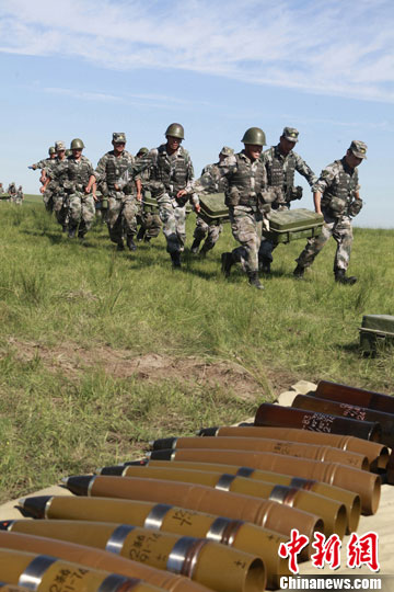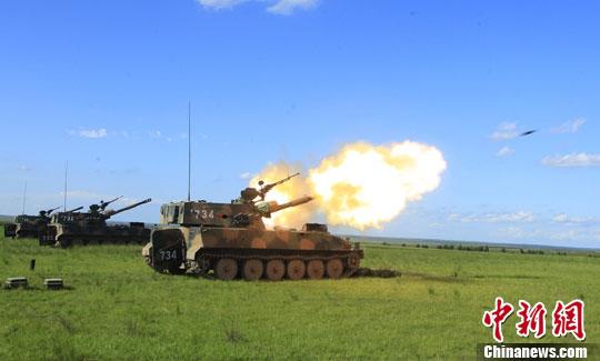 沈阳军区某装甲旅组织炮兵分队近日挺进茫茫草原摆兵布阵,展开了远程机动、占领与转移阵地、昼夜火力打击等战术课目演练,锤炼了部队综合作战能力。图为该旅炮兵分队对“敌”目标实施火力覆盖。中新社发 翁伟立 摄