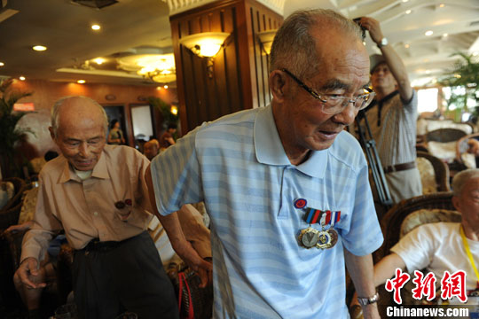 8月2日,20多名四川籍国民党抗战老兵在成都小聚,相互了解目前的生活情况、回忆曾经不平凡的岁月。图为抗战老兵携手参加座谈会。张浪 摄