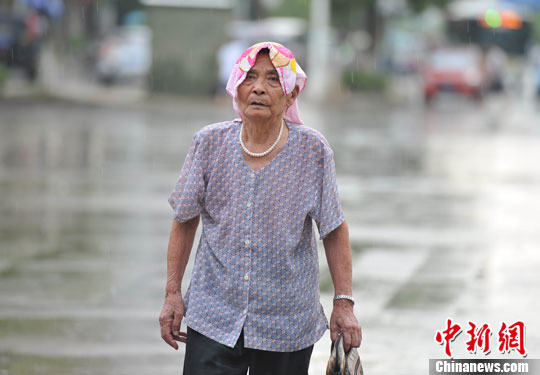 一位老人把毛巾放在头上挡雨。刘占昆 摄