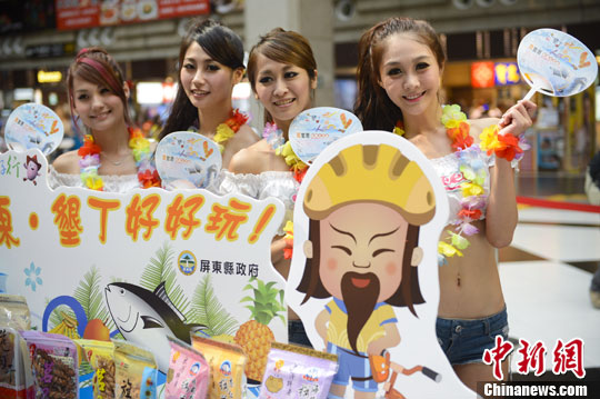 8月2日,台湾屏东县官员在台北车站宣传垦丁旅游,身材火辣的SHOW GIRL现场热舞让民众领略了台湾南部度假的热烈气氛。中新社发 刘震 摄