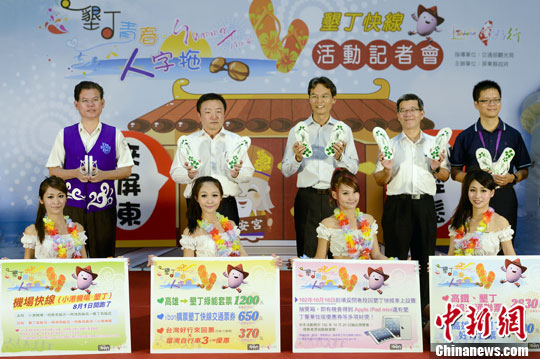 8月2日,台湾屏东县官员在台北车站宣传垦丁旅游,身材火辣的SHOW GIRL现场热舞让民众领略了台湾南部度假的热烈气氛。中新社发 刘震 摄