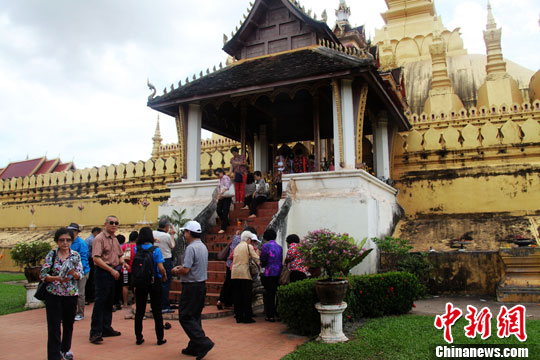 8月2日,老挝首都万象著名景点塔銮寺内,一群泰国游客在轮流上香。中新社发 张明 摄