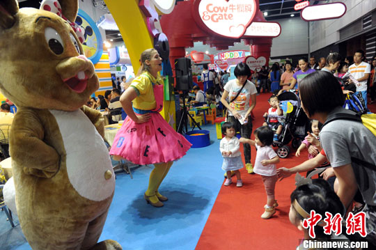 8月2日起,一连四天的“第21届国际婴儿、儿童用品博览”在香港会展举行。图为有参展商派出卡通人物推介美语教材套。中新社发 谭达明 摄