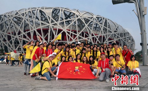 8月4日,来自“中国寻根之旅”的营员们在北京参观了国家体育场“鸟巢”和水立方,来自台湾的营员们摆起了他们熟知的动画英雄的形象。中新社发 张家瑞 摄