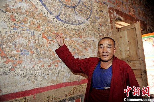 图为僧人克波介绍《香巴拉圣境图》。安源 摄