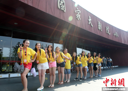 8月5日,来自2013“中国寻根之旅”夏令营的营员们在北京参观了国家大剧院。图为营员们在国家大剧院内合影。中新社发 韩海丹 摄
