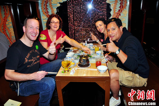 8月6日,,广东首个享受免签入境游团队抵达广州,随后他们“叹早茶”、登“小蛮腰”、参观陈家祠 ,一路畅游广州城。图为游客对地道的广州美食赞不绝口,最喜欢广州肠粉。中新社发 程景伟 摄