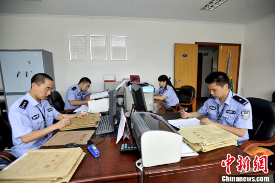 8月6日,四川省锦江监狱为新调训服刑人员搭建亲属快速通讯通道。图为监狱民警审查服刑人员档案。安源 摄