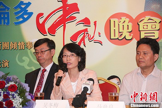 图为中国驻多伦多副总领事吴冬梅(中)在新闻发布会上讲话。中新社发 赖海隆 摄