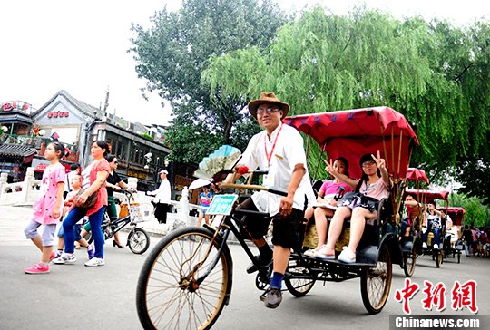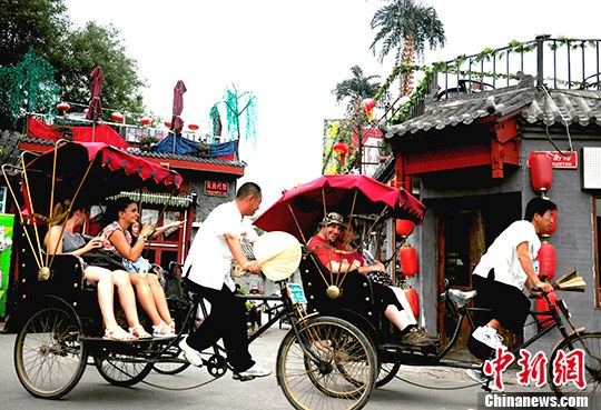8月7日,中外游客游览感受老北京什刹海胡同文化。在连续高温天气后,北京迎来了立秋节气,气温回落。中新社发 张勤 摄