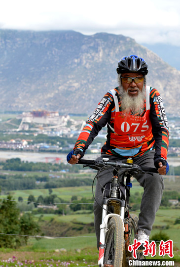 8月7日,年过六旬的花甲老人担珍在比赛中。8月7日,“天堂草原杯”拉萨雪顿节第一届自行车短程速度赛在拉萨举行。中新社发 李林 摄