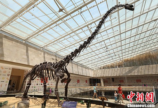 8月7日,市民被体长17米的戈壁克拉美丽龙化石吸引。中新社发 泱波 摄