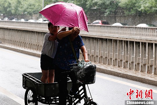8月7日,北京下起阵雨,一位站在三轮车后面的儿童为正在骑车的长辈撑伞。中新社发 刘关关 摄