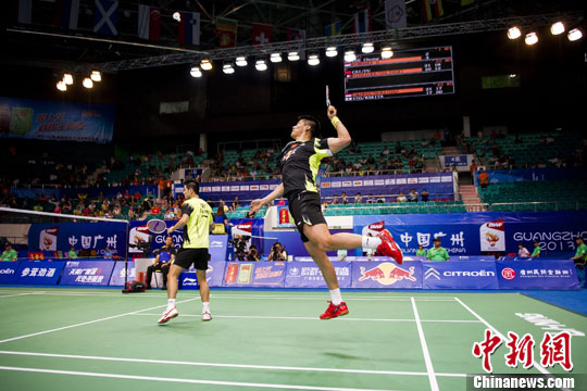 8月7日,2013羽毛球世锦赛进入第三天。在男双第二轮比赛中,8号种子中国组合蔡赟/傅海峰2-0击败比利时的迭瑞克/戈林斯基晋级下一轮比赛。中新社发 龙宇阳 摄
