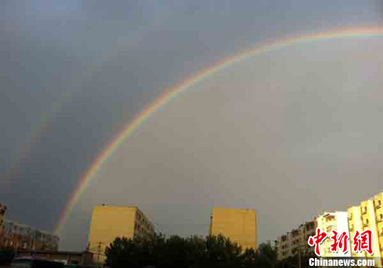 8月8日21时,新疆塔城乌苏市城区一场阵雨过后,上空出现双道彩虹冲天而起,而且主虹的颜色鲜艳,由外圈至内圈呈红、橙、黄、绿、蓝、靛、紫七种颜色,景象十分壮观,引得当地居民纷纷仰首观看。
