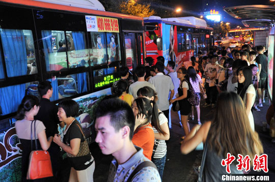 8月13日七夕节,福州众多民众在公交站前等公交车。中新社发 吕明 摄
