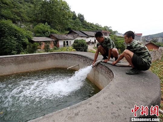 消防官兵向受灾村庄干涸的蓄水池送水。刘宏俊 摄