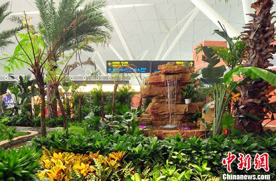 8月14日,T3航站楼内喷泉假山。当日,沈阳桃仙国际机场新航站楼T3航站楼将于8月15日启用。中新社发 于海洋 摄