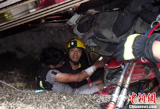 福建重载货车相撞 消防破拆营救被困者